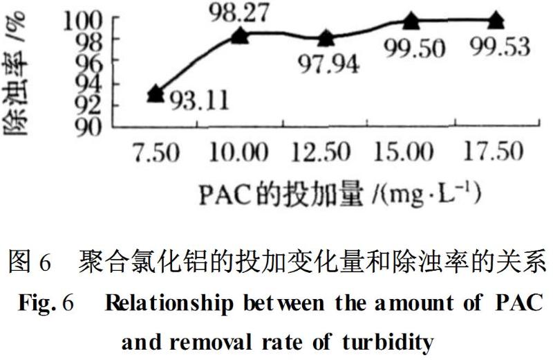 圖6中,在固定聚合硫酸鐵和聚丙烯酰胺投加量(25.0mgL-1聚合硫酸鐵+0.25mgL-1PAM)的條件下,通過改變PAC的投加量來觀察復(fù)配后對(duì)選礦礦廢水的除濁能力,實(shí)驗(yàn)表明,當(dāng)投加量為17.5mgL-1的時(shí)候,水中濁度降至最低,為13.0NTU,除濁率達(dá)到99.53%。考慮處理成本,選擇(25.0mgL-1聚合硫酸鐵+0.25mgL-1PAM+15mgL-1PAC)的復(fù)配組合是為最佳投加量的組合,此種復(fù)配組合在處理效果和處理成本上都較前兩種配方更有優(yōu)勢(shì).