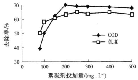 由圖3可知,當絮凝劑聚合氯化鋁鐵投加量為200mg/L時,COD去除率為70%,色度去除率為63%,即絮凝后出水COD為69mg/L,色度為44倍,出水水質(zhì)達到《污水綜合排放標準》(GB8978-1996)中的一級排放標準。